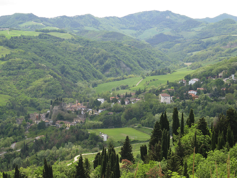 Vista panoramica delle vallate intorno a Predappio Alta e il suo castello medioevale risalente al 1200 dc